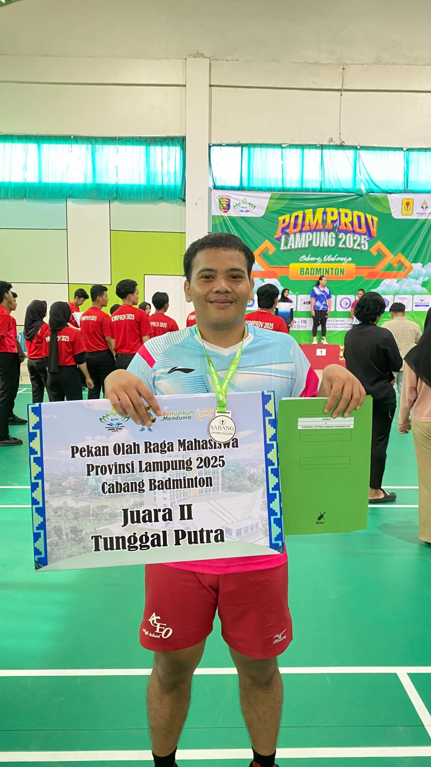 Bandar Lampung,Sergap88.com–Prestasi membanggakan kembali ditorehkan oleh mahasiswa Institut Informatika dan Bisnis (IIB) Darmajaya. Doneo Daud Purba, mahasiswa Program Studi Sistem Informasi/Inovasi Digital, berhasil meraih Juara II dalam cabang olahraga Bulu Tangkis Tunggal Putra pada ajang Pekan Olahraga Mahasiswa Provinsi (POMProv) Lampung 2025 yang digelar pada Sabtu – Minggu, 5 – 6 Juli 2025, di UIN Raden Intan Lampung.