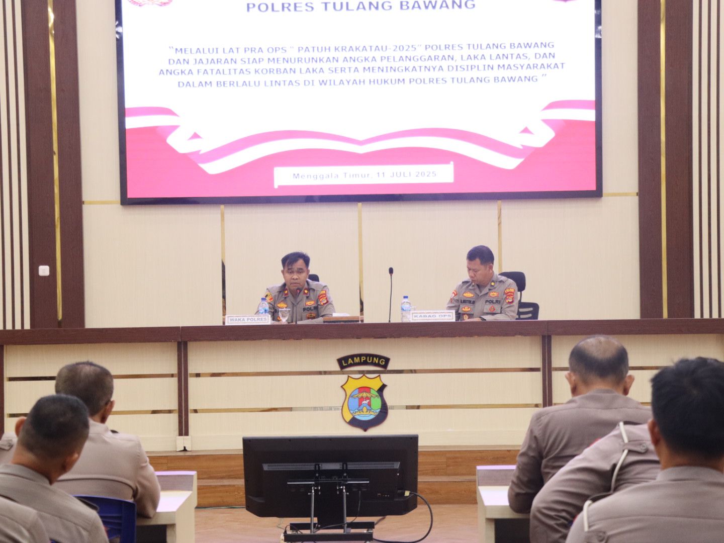Kegiatan Lat Pra Ops Patuh Krakatau 2025 yang dilaksanakan oleh Polres Tulang Bawang ini berlangsung hari Jum’at (11/07/2025), pukul 14.00 WIB s/d selesai, di Aula Wira Satya Mapolres Tulang Bawang.