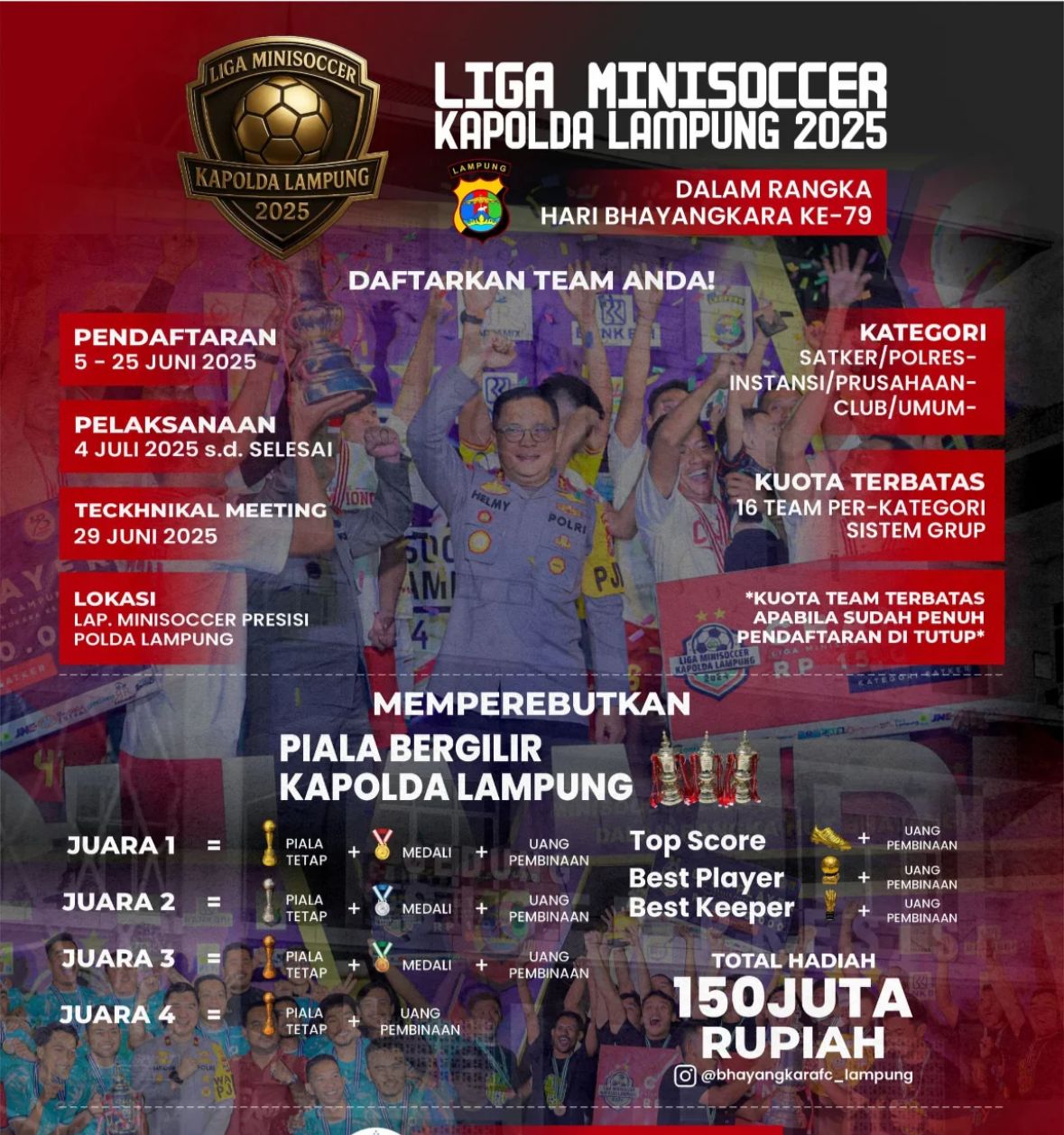 Mari saksikan dan dukung tim-tim favorit Anda dalam gelaran Minisoccer Kapolda Cup 2025. Jadilah bagian dari semangat kebersamaan dan sportivitas yang akan mewarnai turnamen ini.(*)
